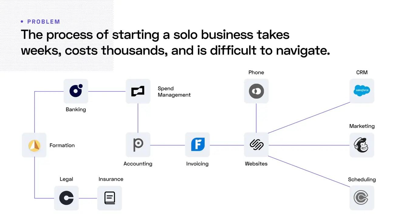 - Problem: The process of starting a solo business takes weeks, costs thousands, and is difficult to navigate.
