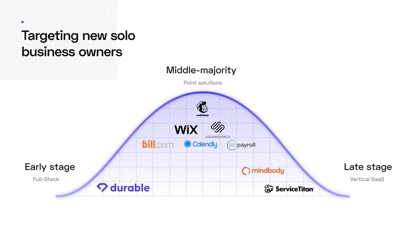 The slide eloquently positions Durable as a solution in the early stage of a business for solo entrepreneurs while pointing out more complicated solutions for late-stage companies looking for point solutions or operating platforms.