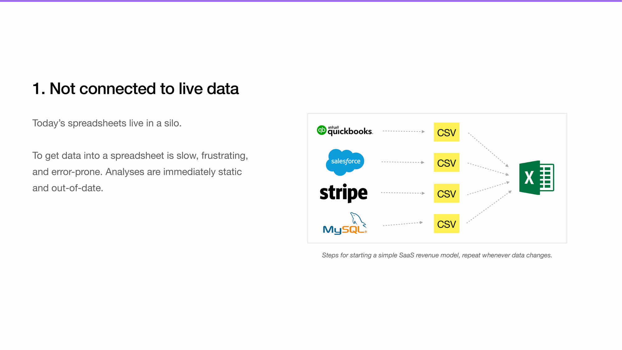 - Problem: Startups often struggle with analyzing data as traditional spreadsheets require manual data entry and lack direct connections to live data.