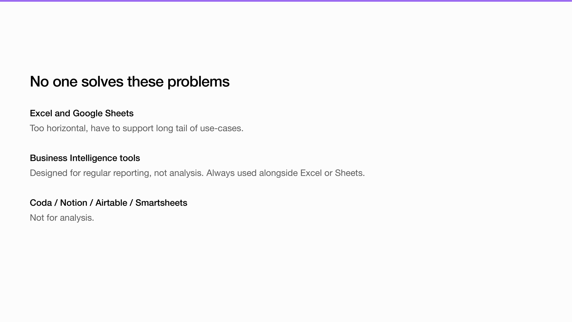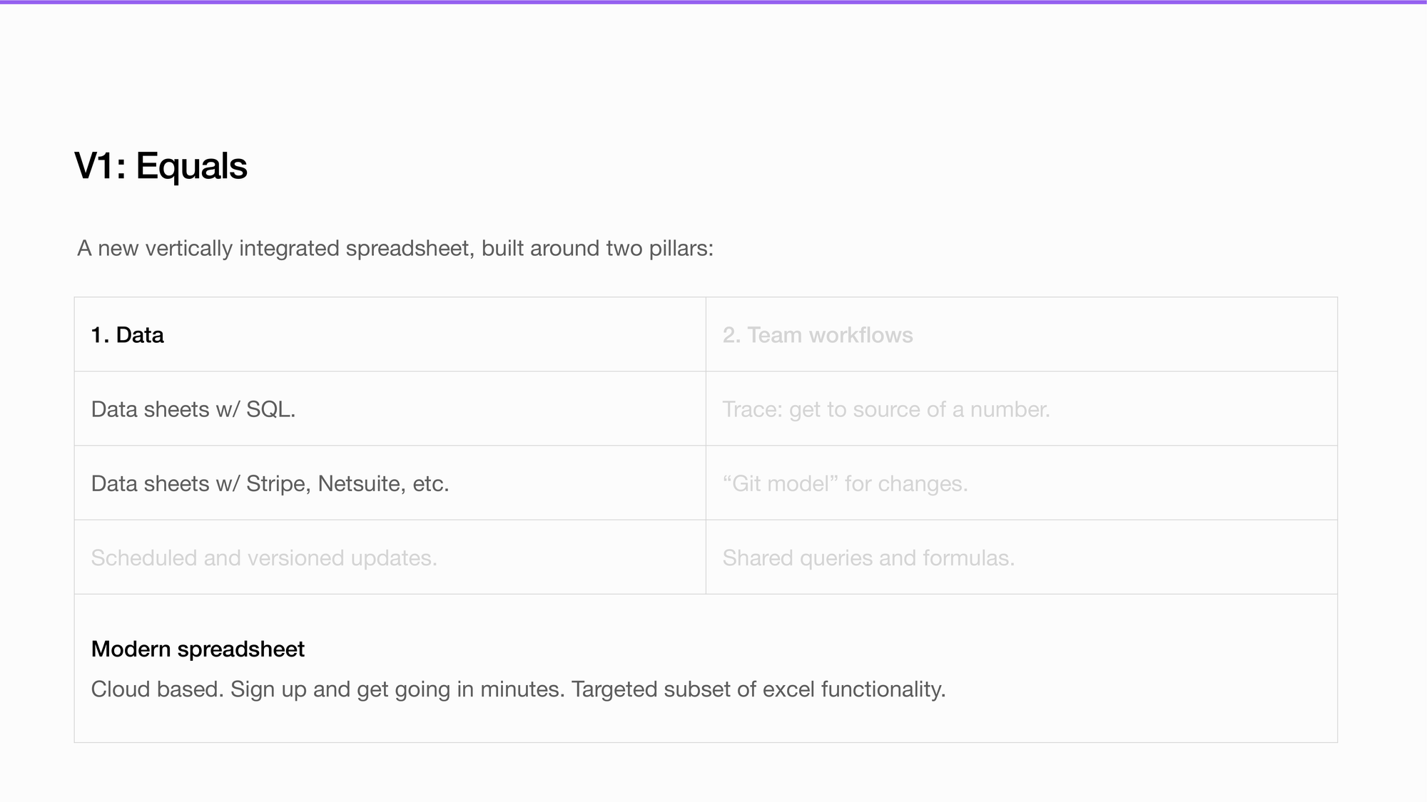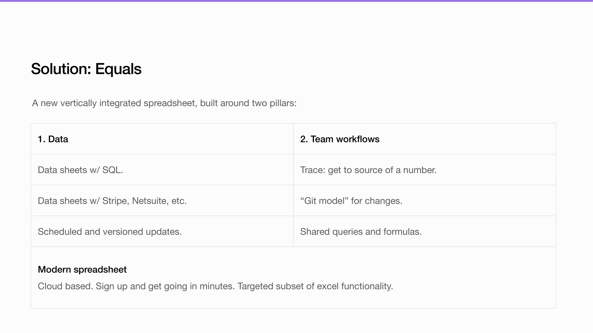 - Distilled Problem Statement: The Equals team set themselves up for a great inception story given their frustrations with the current state of spreadsheets.